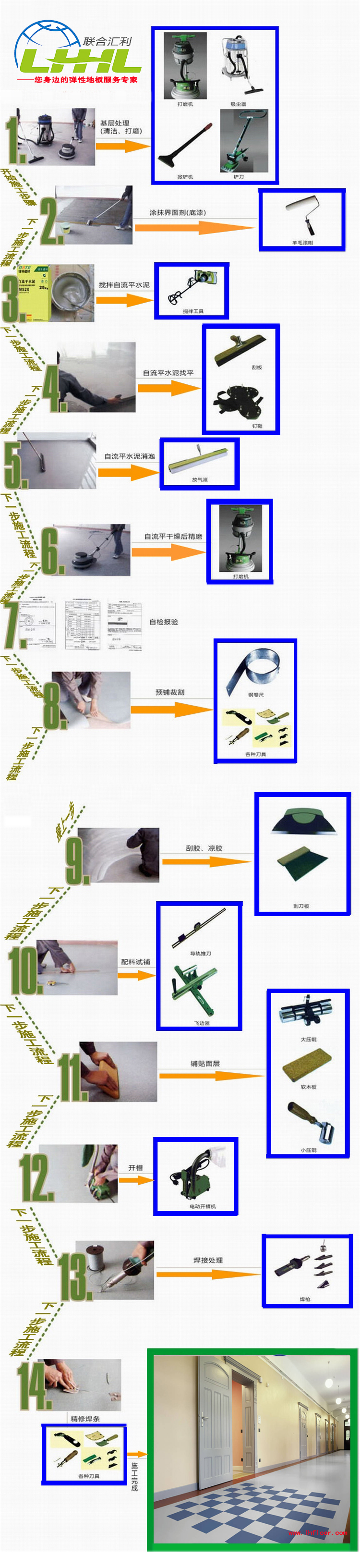佛山市聯合匯利地板有限公司專注于人類高級彈性防滑地面系統產品的設計/開發/生產/銷售/安裝/和服務,產品主要應用在體育系統/醫療系統/教育系統/商業系統/辦公系統/工業系統/交通系統/家居系統等地面,目前在廣東、江蘇、河北有大型生產基地和配套物流倉庫,公司引進韓國設計師設計專業展廳,分為地板產品展示區/地板配件展示區/地板施工輔料展示區/地板施工工具展示區,是目前華南地區甚至國內罕見的大型實體彈性地板服務公司,是名符其實的彈性地板4S店,提供的產品款式近千款,客戶面積超過一定數量的話,可以根據客戶要求定制任何花色或者圖案,幾乎滿足您的任何場合設計或者效果要求,為了保證工程質量,花巨資引進全套德國進口彈性地板施工工具,250人強大施工隊伍全國上門施工為您服務,專門承接大型PVC地板工程項目。以塑造一流品質,追求客戶滿意為質量方針和目標,我們正努力打造華南地區甚至全國最專業彈性地板大型實體公司.熱烈歡迎全國各地客戶上門考察洽談指導。